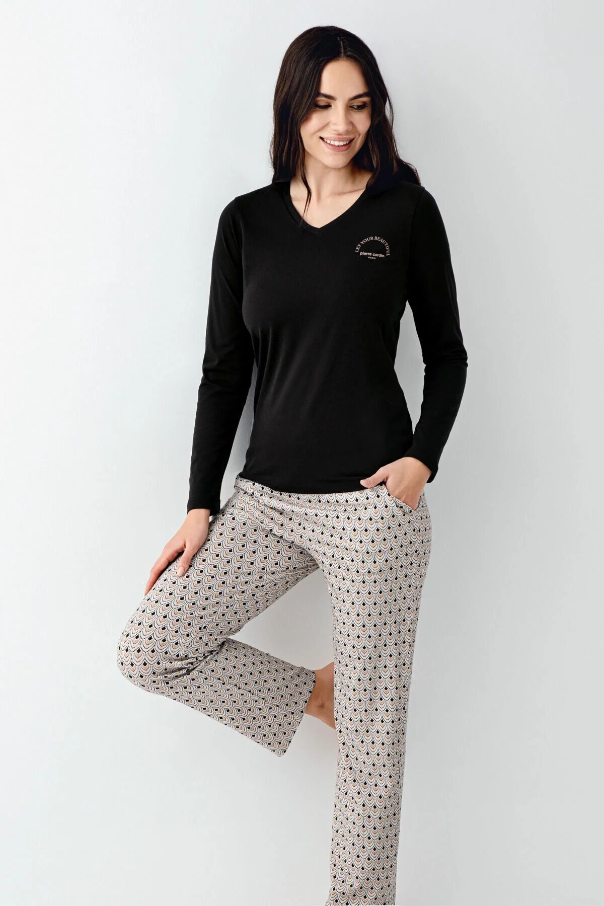 Pierre Cardin 9101 Kadın Uzun Kollu V Yaka Pijama Takımı-SiyahBirinci sınıf penye modal kumaştan dikilen takımımızın beli lastiklidir. Günlük kullanıma uygun rahat, zarif ve şık bir modeldir. Yumuşak ve hava alan yapısı ile konforlu ve rahat bir kullanım sağlar. Orjinal paketi ile gönderim yapılmaktadır. Çekme veya Solma yapmaz. Yıkama talimatına uygun yıkayınız. Çamaşır makinesinde 30°C sıcaklıkta hassas yıkamada ters çevirerek yıkayın. Benzer renklerle yıkayın. Çamaşır suyu kullanmayın. Yüksek esneme yeteneğine sahip özelliği sayesinde formunu kaybetmez.Ürün İçeriği: %50 modal %50 pamuk